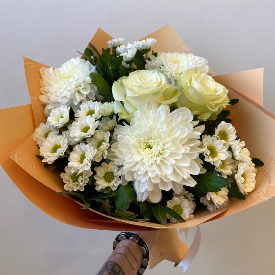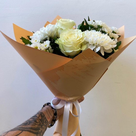 Букет приехал свежий, не пах “складом”. Композиция гармоничная. Получателю очень понравилось.