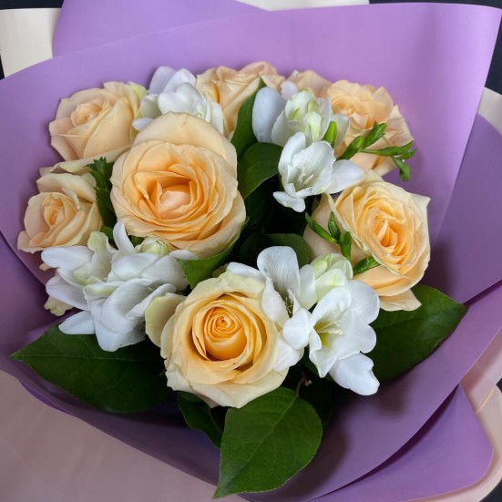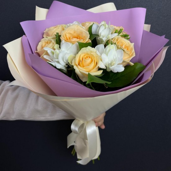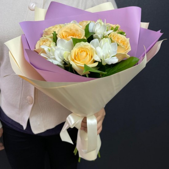 Букет приехал свежий, не пах “складом”. Композиция гармоничная. Получателю очень понравилось.